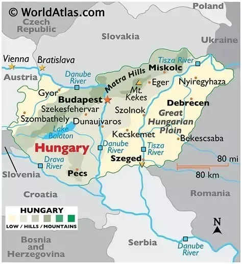 Geographically, Hungary sits in the lowlands below the Carpathian Mountains, and Budapest is bisected by the Danube River. The country is bordered by Austria, Slovakia, Ukraine, Romania, Serbia, and Slovenia (clockwise from west to East)